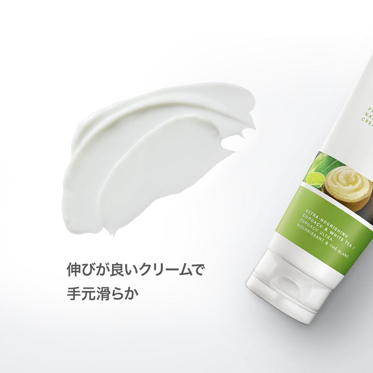 皮脂に近い成分でお肌を保湿するシアバター、カカオバターに加え、肌への馴染みが良いクプアスバターでより長時間潤いをキープし、肌を滑らかに整えるハンド&ネイルケアクリーム。