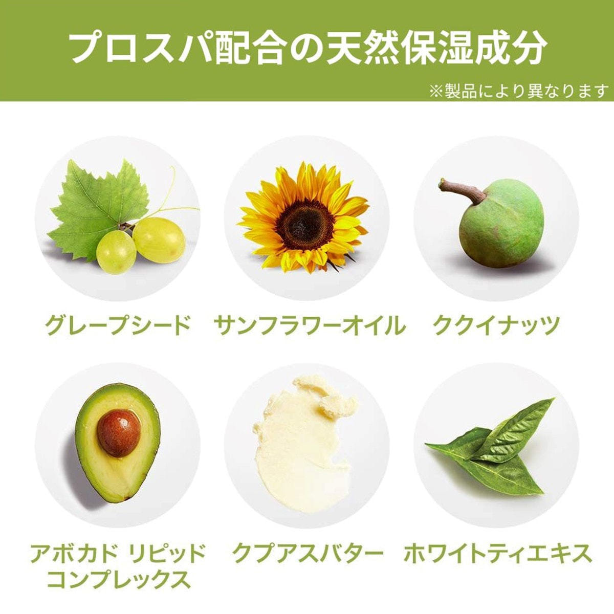 水、サフラワー油、ケイソウ土、グリセリン、セテアリルアルコール、ステアリン酸グリセリル、ステアリン酸、シア脂、オリーブ油脂肪酸セテアリル、オリーブ油脂肪酸ソルビタン、トリ(カプリル酸/カプリン酸)グリセリル、ベヘニルアルコール、ステアリン酸ポリグリセリル-3、ベルガモット果実油、オレンジ果皮油、ショウズク種子油、レモン果皮油、アロエベラ液汁、ゴマ種子油、アボカド油、トコフェロール、ヒマワリ種子油、結晶セルロース、セルロースガム、スクレロチウムガム、クエン酸、安息香酸Na、ベンジルアルコール、デヒドロ酢酸、香料