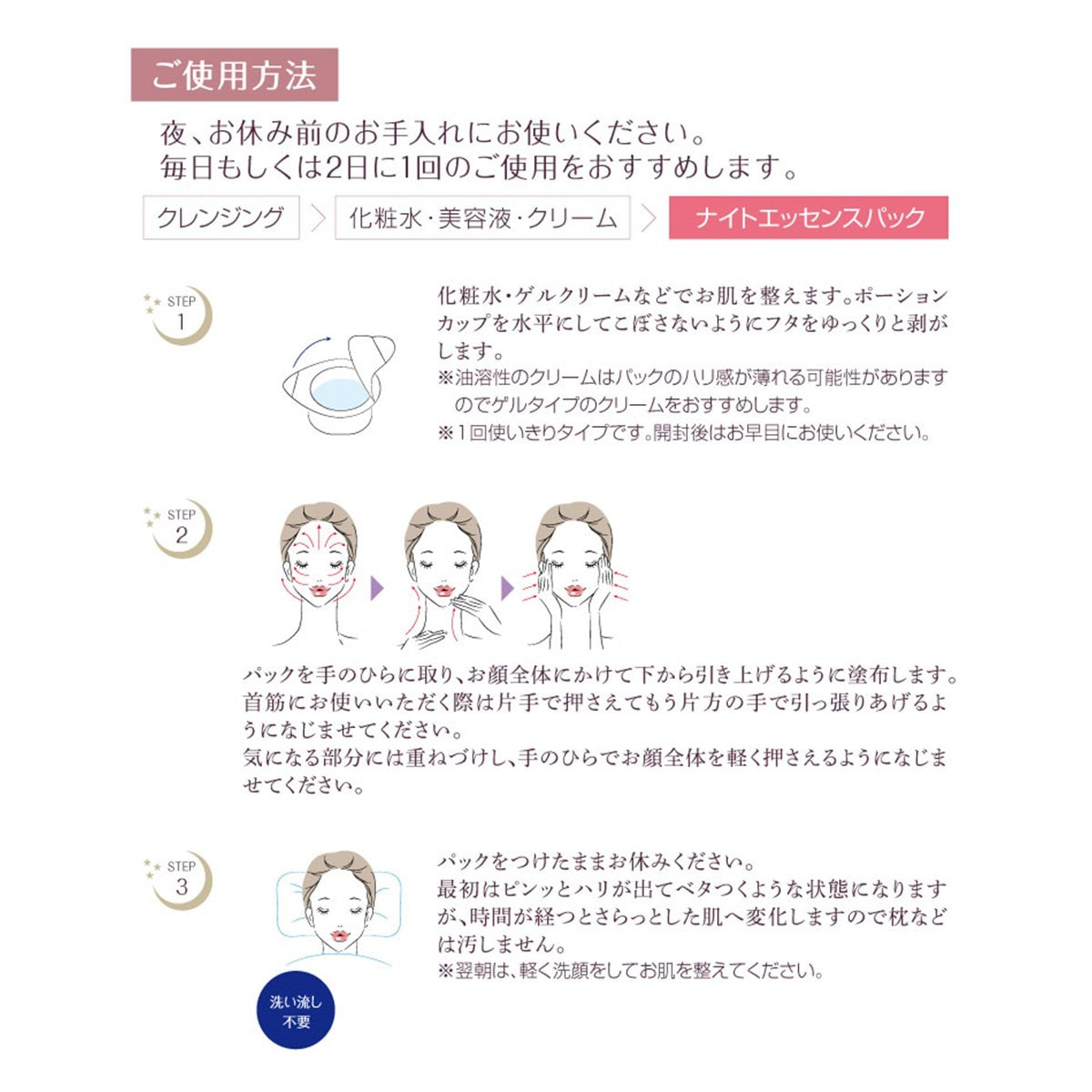 睡眠中のターンオーバーに着目したナイトエッセンスパックは、 お休み前に塗るだけの簡単液状パックです。 EGF(上皮成長因子)と厳選した美容成分がお肌をイキイキとさせ、 健やかに保ちます。