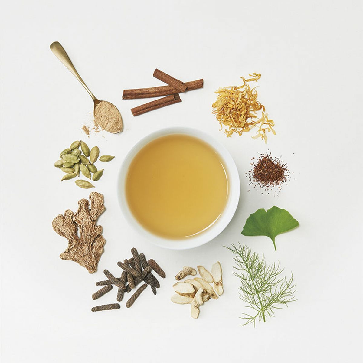 スチームジンジャー(中国産)、ジンジャー、シナモン、ルイボスレッド、ヒハツパウダー、マカルートパウダー、みかんの皮、フェンネル、マリーゴールド、カルダモン、ギンコウ